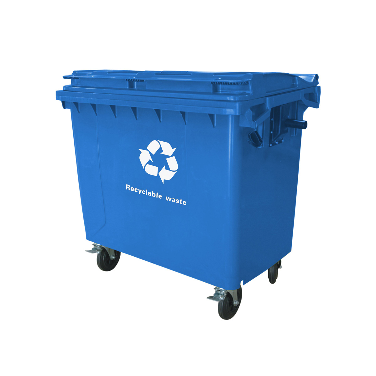 Κάδος ανακύκλωσης μπλε 660 λίτρων, με ανοιγμένο καπάκι, κατασκευασμένος από ανθεκτικό υλικό. Ιδανικό για επαγγελματική χρήση. Έχει ρόδες για εύκολη μεταφορά.