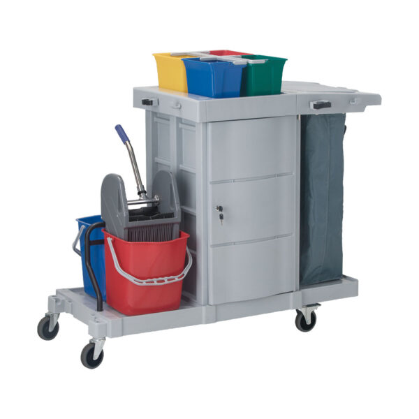 Πολυχρηστικό καρότσι καμαριέρας με ντουλαπάκι που κλειδώνει, 4 κουβάδες των 6L, σακούλα 75L και 2 κουβάδες σφουγγαρίσματος των 18L ο καθένας.