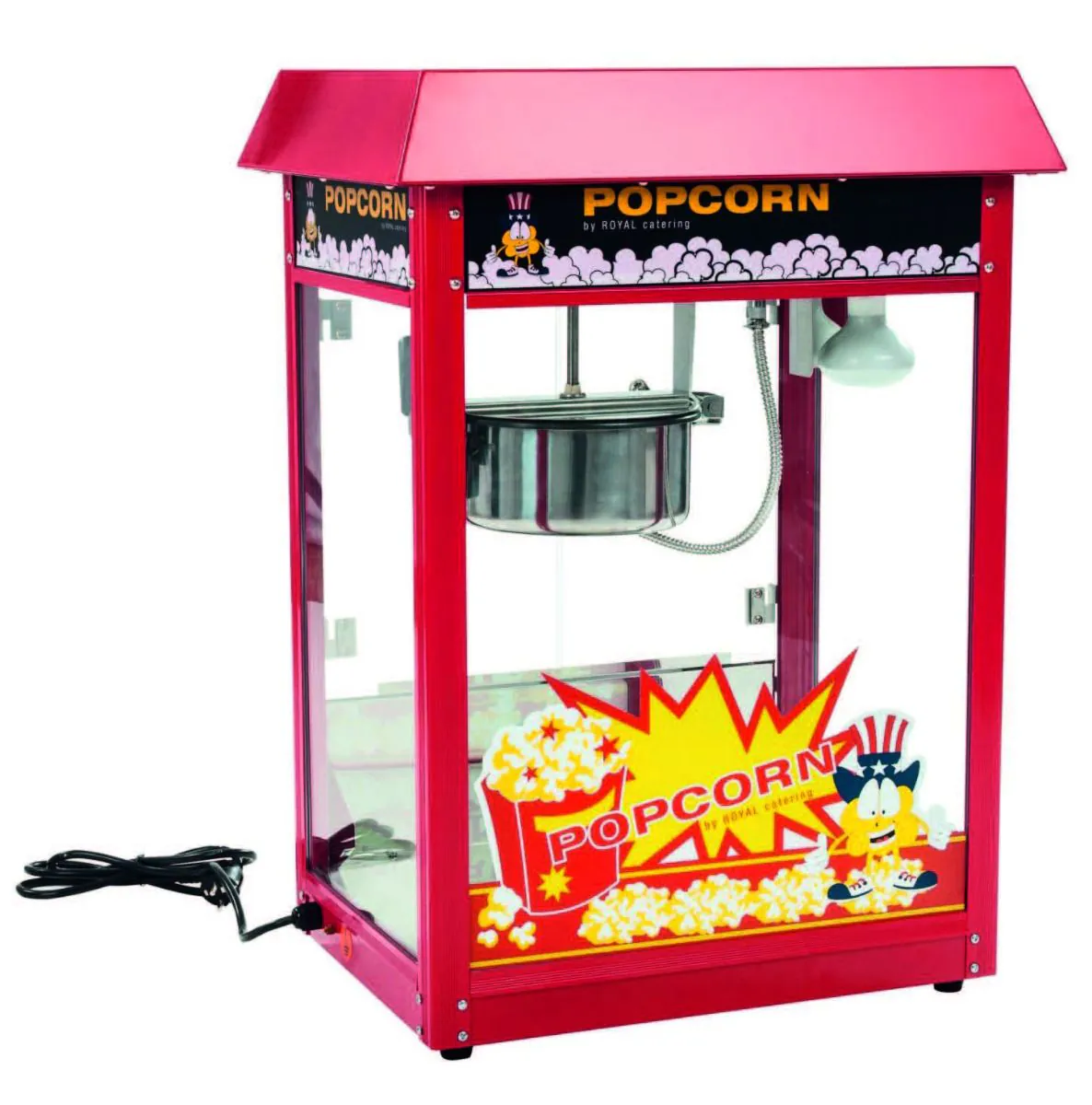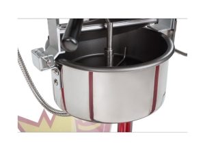 Ρετρό μηχανή popcorn επαγγελματικής χρήσης, σε κόκκινο χρώμα με έντονα γραφιστικά. Η μηχανή είναι κατασκευασμένη από ανοξείδωτα μέρη, επικαλυμμένο σίδηρο και χυτό αλουμίνιο. Διαθέτει κατσαρόλα αλουμινίου με αντικολλητική επίστρωση, Ø185mm χωρητικότητας 8oz.