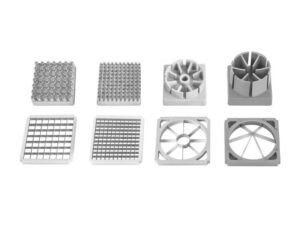 Για να ικανοποιήσει τις ιδιαίτερες απαιτήσεις σας, το RCKS-4 διαθέτει πέντε ένθετα μαχαιριών από ανοξείδωτο χάλυβα, τρία από τα οποία είναι τετράγωνο και δύο κύκλους. Τα τετράγωνα μαχαίρια έχουν μέγεθος κοπής 12 x 12, 10 x 10 ή 8 x 8 χιλιοστά και είναι ιδιαίτερα χρήσιμα στην παραγωγή φυτικών ραβδιών, σε κύβους ή κύβους και πατάτες τηγανητές.