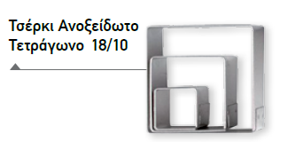 Κωδικός προϊόντος: 60-20Χ20 Κατηγορίες: ΕΡΓΑΛΕΙΑ ΖΑΧΑΡΟΠΛΑΣΤΙΚΗΣ-ΜΠΟΥΓΑΤΣΑΣ-ΚΡΕΠΑΣ-ΒΑΦΛΑΣ, ΤΣΕΡΚΙΑ-ΚΟΠΤΕΣ&ΣΠΑΤΟΥΛΕΣ ΖΑΧΑΡΟΠΛΑΣΤΙΚΗΣ Ετικέτα: ΤΣΕΡΚΙ ΙΝΟΧ 18/10 ΤΕΤΡΑΓΩΝΟ 20x20